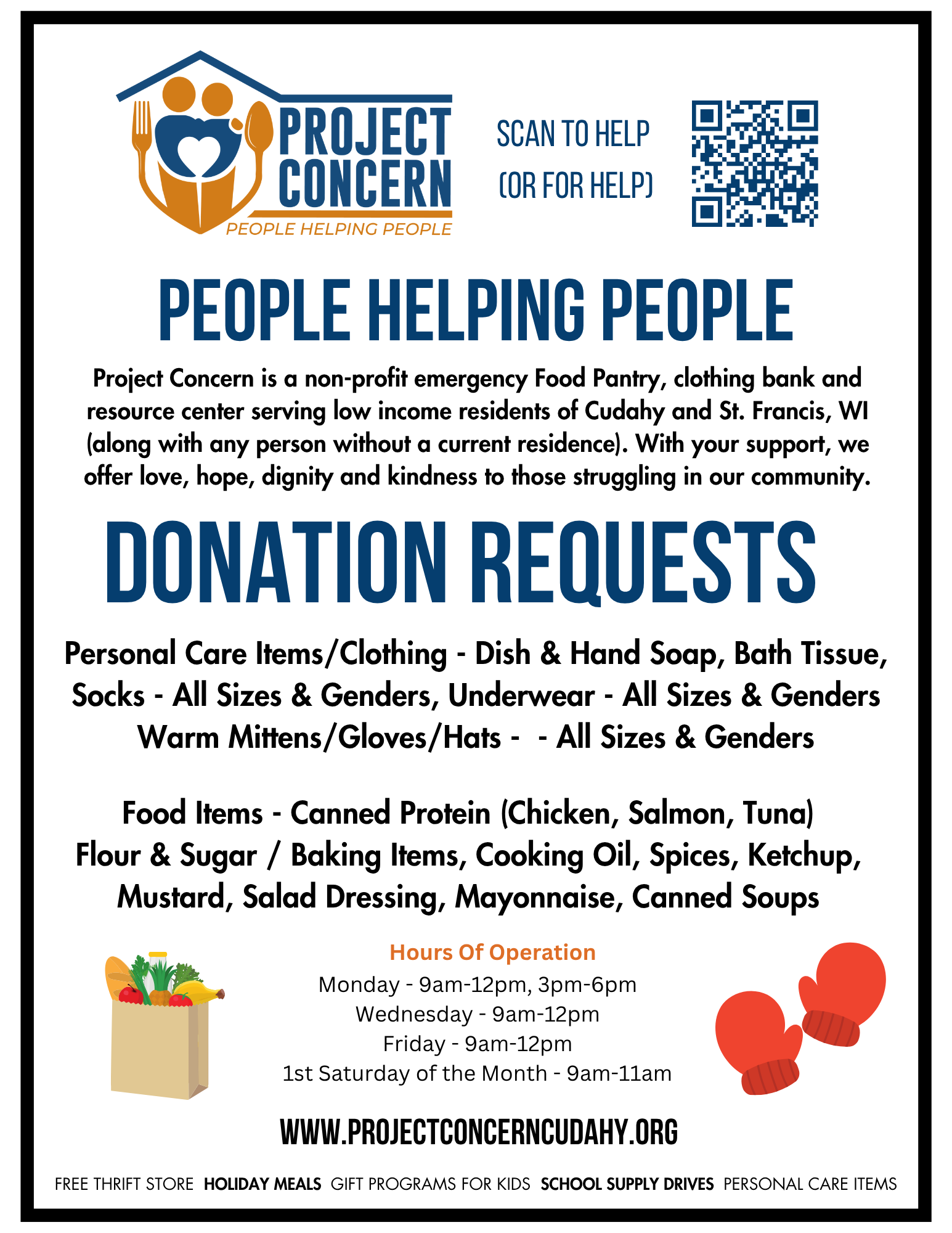 Don’t see what you’re looking for? Email us at info@projectconcerncudahy.org and we can create something for you!